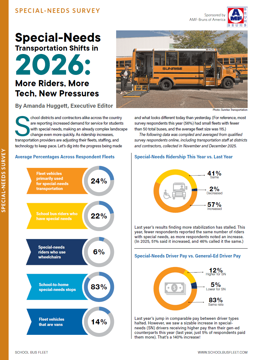 What’s changing in special-needs transportation? This year, student transportation operators report a rising need, easing driver shortages, growing tech adoption, and evolving challenges. Sponsored by AMF Bruns of America.